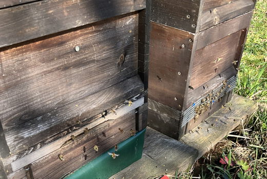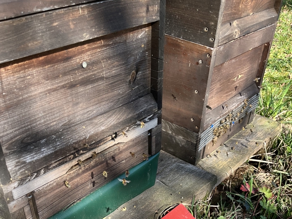 Zunächst entfernen wir die Mäusegitter. Dadurch erleichtern wir unseren Bienen, die jetzt bepackt mit Pollen kommen das Einkrabbeln in ihren Bienenkasten. Kein Pollenhöschen soll am störenden Gitter abgestreift werden.