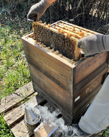 Zum Schluss wird der Futtervorrat im Volk abgeschätzt. Der beim "hinten Anheben" leichteste Kasten wird von Wolfgang geöffnet und der Futtervorrat kontrolliert. Wir haben gut eingefüttert. Unsere Wirtschaftsvölker, die auf zwei Magazinen überwintert haben, sind noch gut mit Futter versorgt.
