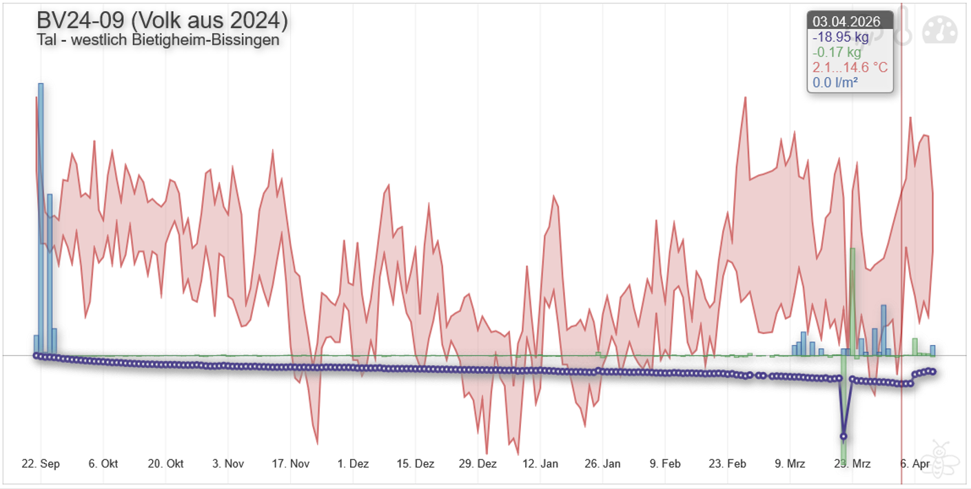 Eine unserer "Tätigkeiten" im Frühjahr ist auch, die Daten der Überwinterung von der Stockwaage zu sichern und die Stockwaage auf das aktuelle Trachtjahr einzustellen. Dabei dokumentieren wir immer den gemessenen Futterverbrauch während der Überwinterung, bevor die erste nennenswerte Tracht im Frühjahr eingesetzt hat. Im Winter 2025 - 2026 waren dies 18,95 kg bei unserem Stockwaagenvolk, welches auf zwei Magazinen überwintert hat.