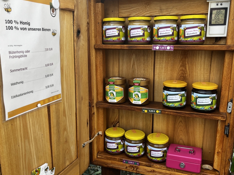Unser 24/7 Verkaufsbox kann dieses Jahr "leider" schon Anfang Oktober geöffnet werden. Die aktuellen Temperaturen beeinflussen die Honigqualität nicht mehr. Deshalb kann man sich jetzt wieder rund um die Uhr an jedem Wochentag vor unserer Gartentüre (Bietigheim, Strombergstr. 8) mit Honig versorgen. Alle von uns angebotenen Sorten gibt es auch in unserer Verkaufsbox.